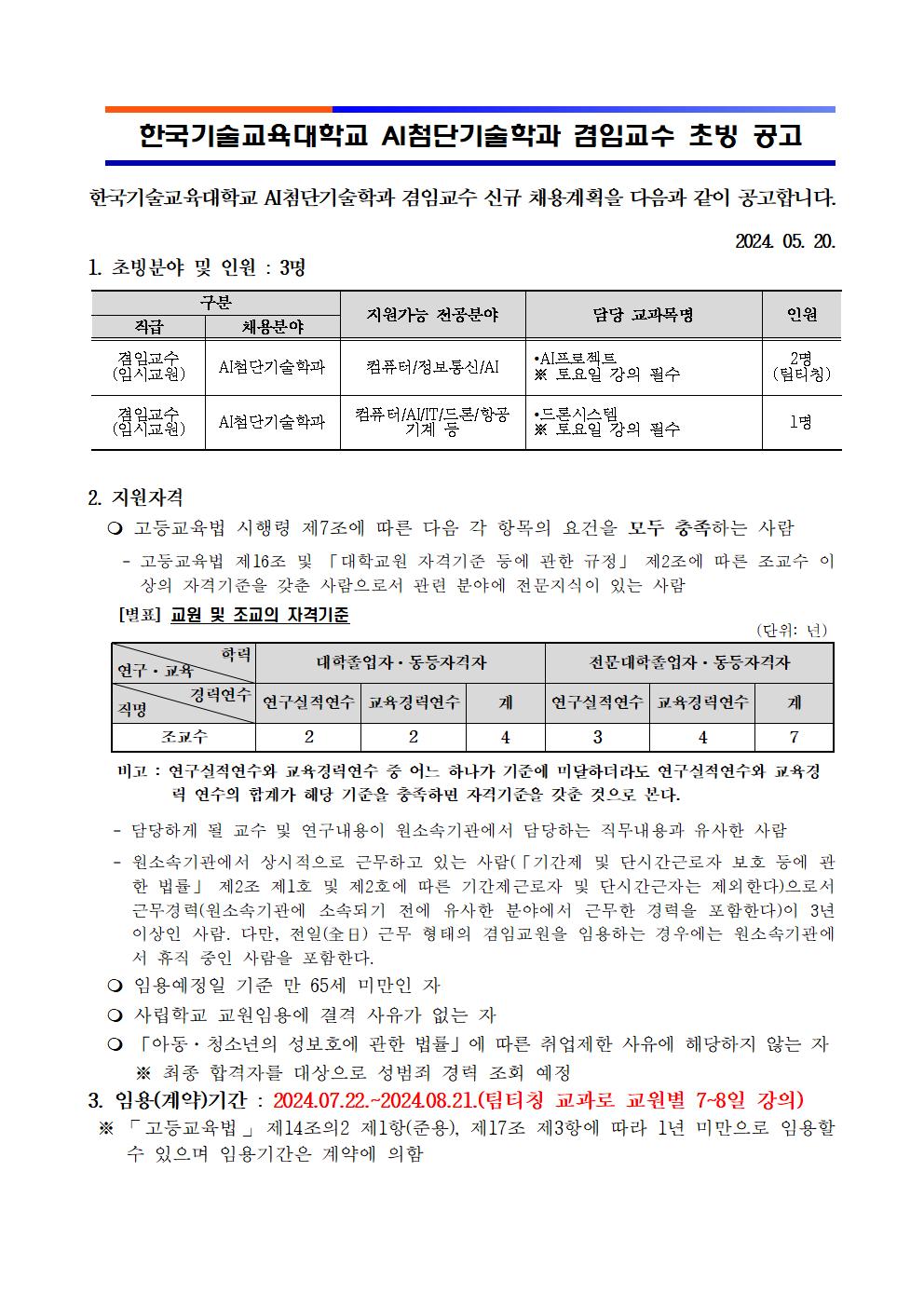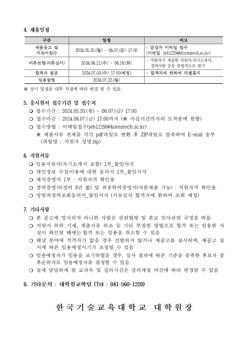 한국기술교육대학교 대학원 겸임교원 채용공고