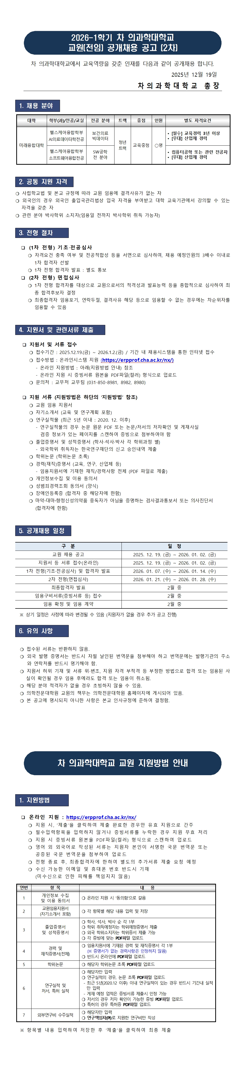 2026학년도 1학기 차 의과학대학교 전임교원 2차 공개채용 공고