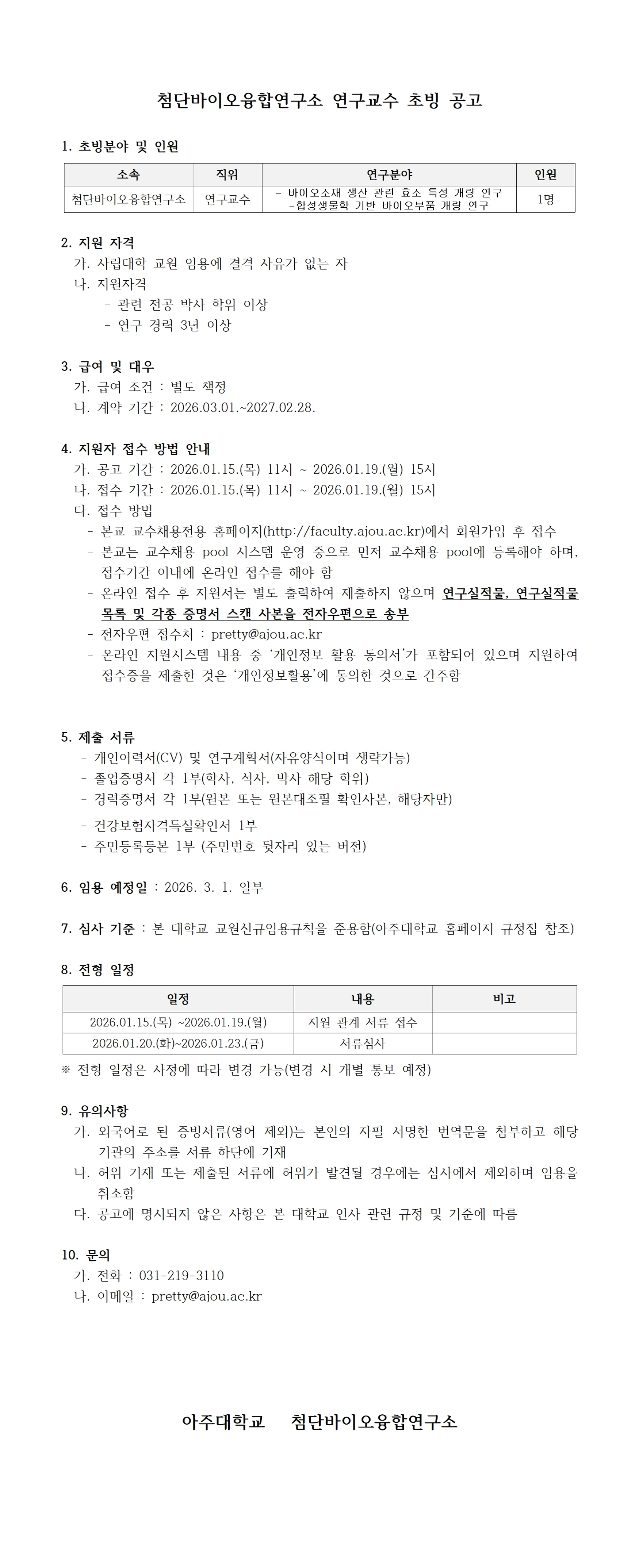 2026학년도 1학기 첨단바이오융합연구소 연구교수 초빙 공고