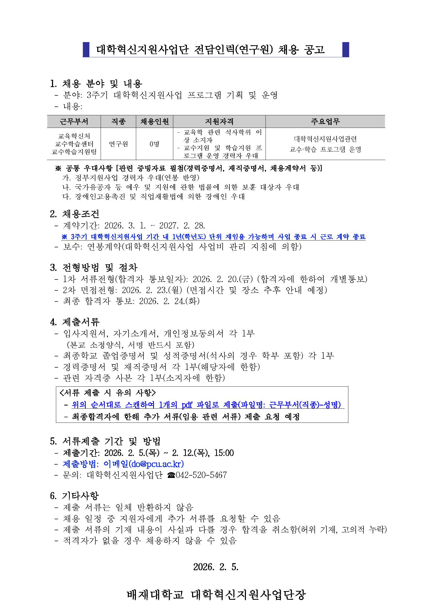 2026 대학혁신지원사업 연구원 채용 공고