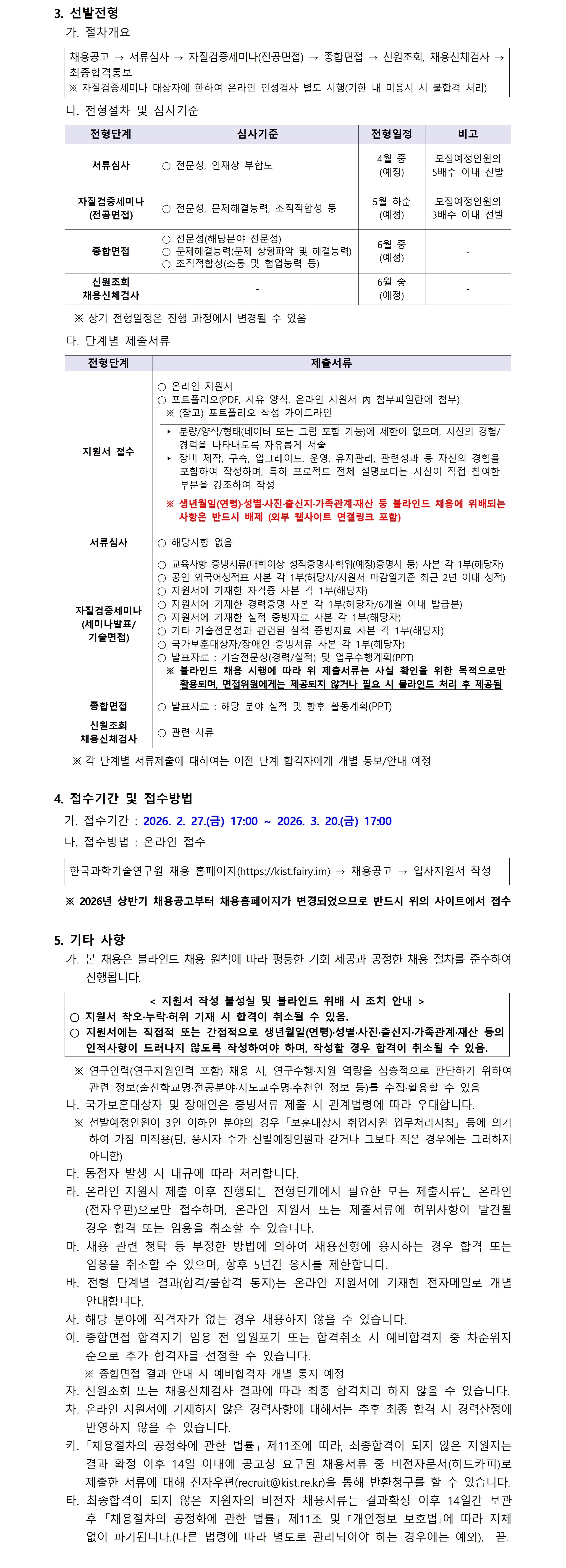 2026년도 KIST 제1차 연구기술지원부문 공개채용