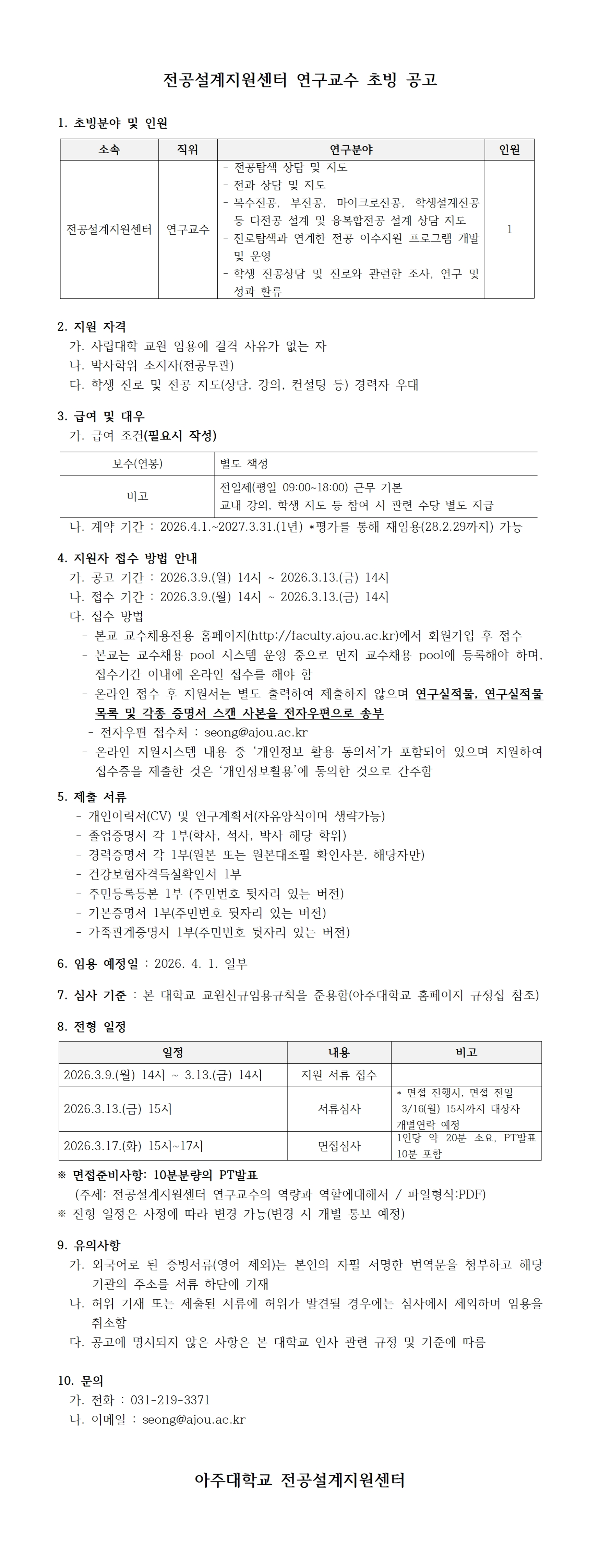 2026학년도 1학기 전공설계지원센터 연구교수 초빙 공고